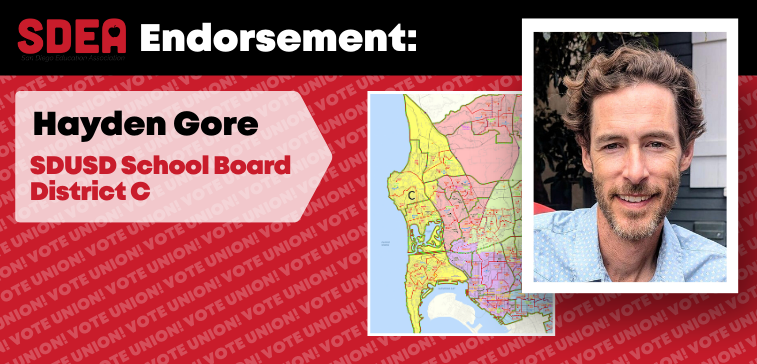 This Fall, voters in District C will vote to replace Cody Petterson on San Diego Unified’s school board. SDEA members have endorsed Hayden Gore, an experienced educator and current middle school teacher who was an organizer and the first union president for the High Tech Education Collective, the union representing certificated and classified staff at California’s second-largest unionized charter network.