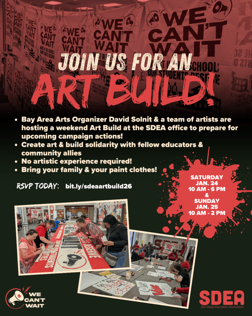 Join fellow educators, families, and community members and a statewide team of artists who will host a weekend of art at the SDEA office! Across the state, other union educators are having similar art builds, like the one in Richmond which helped fuel UTR’s four-day strike (and win!)