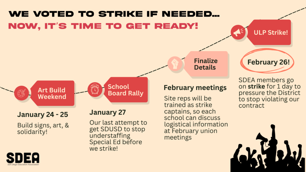 SDEA members have spoken loudly and clearly! More than 90% of participating members voted to authorize a one-day Unfair Labor Practice (ULP) strike if San Diego Unified continues violating our contract on Special Education staffing. After reviewing this overwhelming YES vote, the SDEA Board of Directors has set a strike date: Thursday, February 26! Now, it’s time to make sure we’re ready: Getting the word out, building community support, and making sure every school community is ready for their first strike in decades.