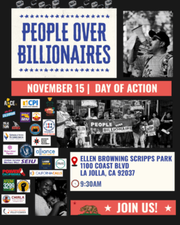 We’re uniting - labor and community - to push back against the authoritarian attacks on our students and families and fight for a vision and agenda that puts people first. We reject the scapegoating and divisions that attempt to divide us. Some very powerful corporate billionaires are supporting and enabling these attacks and advancing a “billionaires first” agenda that allows the rich to become richer while the rest of us struggle to make ends meet. We need to take the fight to them. Join us on Saturday, December 6, at 9:30 am at Ellen Browning Scripps Park in La Jolla!