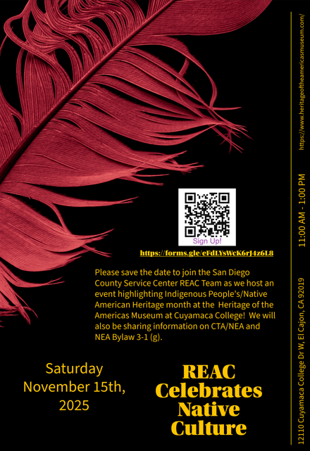 In honor of Indigenous People's / Native American Heritage Month, REAC is hosting an event for educators to learn and grow in their understanding of histories as we network, share stories and build solidarity on November 15th (Saturday) from 11am - 1:00pm at the Americas Museum at Cuyamaca College. RSVPs are due November 13th, 2025. RSVP here or by scanning the code in the image below.