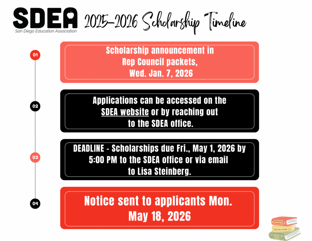 For further assistance with SDEA scholarships, contact Lisa Steinberg at SDEA (619) 283-4411 or steinberg_l@sdea.net.
