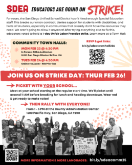 For years, the San Diego Unified School District hasn’t hired enough Special Education staff. This breaks the union contract of SDEA educators, denies support for students with disabilities, and hurts all students, especially in communities that already don’t have the resources they need. After trying everything else to fix this, educators voted to hold a 1-day Unfair Labor Practice strike.